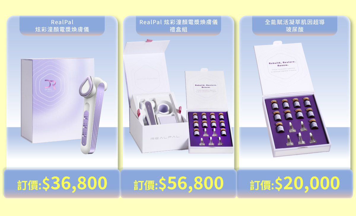 RealPal 炫彩潼顏電漿煥膚儀禮盒組:醫美級冷電漿技術結合全能賦活玻尿酸 AB 劑,專為突破保養瓶頸設計。透過 Plasma 與 EMS 微電流雙模式,5 倍提升活生肽安瓶吸收率,深層修護細紋、緊緻輪廓,讓肌膚重現水潤潼顏。居家也能享受黑科技護膚體驗!